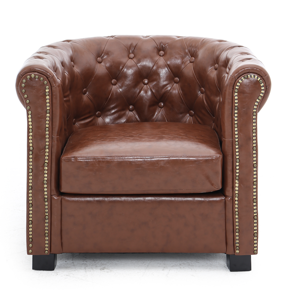 Brown leather upholstery, PU+sponge, wooden frame, wood & rubber legs