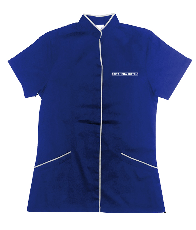 Full buttoned tunic with pockets to hips, relaxed hem and sleeves. Style has contrast white piping to pockets, collar and front placket.