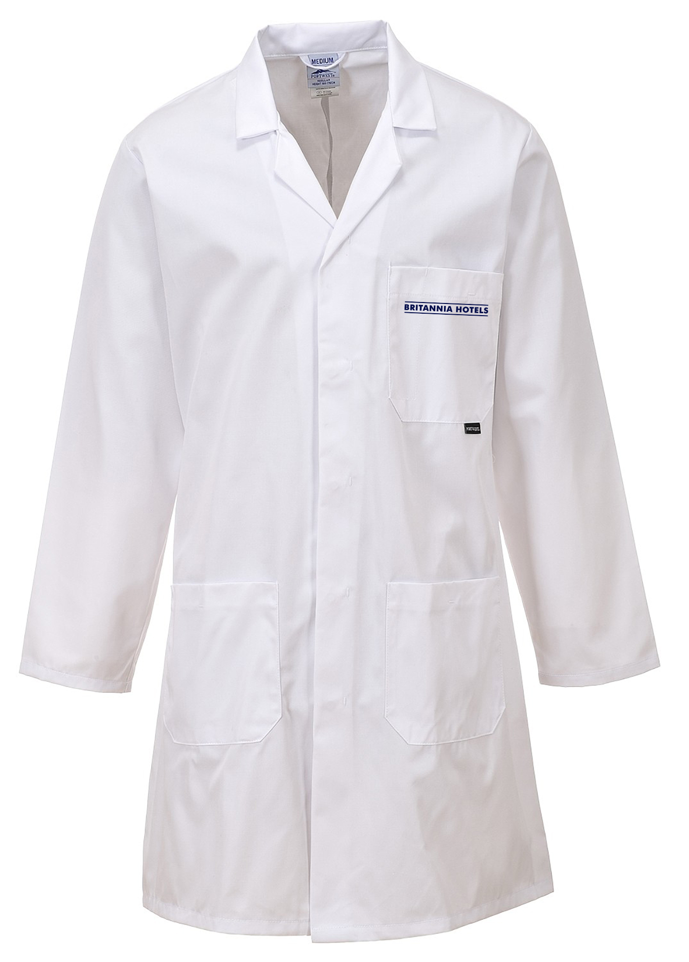 A Standard white lab coat with hip pockets and left chest pocket.